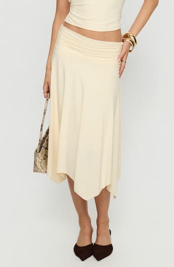 A trendy low-rise waist is balanced by a fluttery asymmetric hem on this figure-skimming skirt that's perfect for casual and more elevated looks.