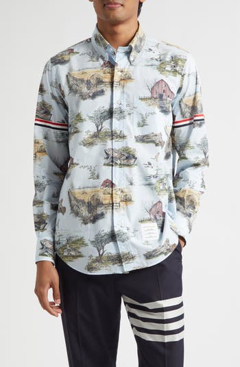 From Browne's whimsical musings on the avian world—'Sweet as a Bird's Song'—comes this crisp cotton-poplin shirt featuring flocks of geese as taking their seasonal rest in scenic wetlands. Signature red, white and blue stripes star in grosgrain bands on each sleeve.