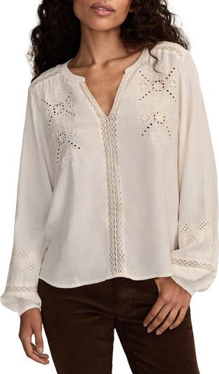 Intricately patterned Schiffli lace and embroidered eyelets pattern a peasant top finished with a curved hem that looks great untucked and flowing in the breeze.