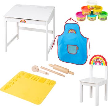 PLAY-DOH: SCHOOL DESK WITH CHAIR - The Play-Doh School Desk collection is a fantastic way to spark creativity in young artists while providing a functional workspace. This delightful set features a sturdy table with a top lid designed for easy access to hidden storage, complete with damping fittings that ensure smooth operation and safety. Accompanied by a comfortable chair, it creates an inviting environment for children to dive into their creative projects. The collection includes a 30x40 cm | 11.81 x 15.75 inches 3D creative silicone play mat, enhancing the crafting experience with its engaging surface. Essential tools like a rolling pin, pizza cutter, and modelling tool empower kids to bring their imaginative ideas to life. Additionally, with six 1 oz containers of vibrant Play-Doh modelling clay in red, yellow, blue, green, white, and berry, children have the perfect palette to mix and mold their creations. This set FEATURES FSC-certified wooden tools and BPA Free Silicone. The all-in-one desk set not only promotes fine motor skills and imaginative play but also provides a structured space for endless fun and exploration, making it a must-have for any playroom! Set INCLUDES: 1 Apron, 3 Wooden Tools, 1 Silicone Mat, 1 desk, 1 chair, and 6 containers of Play-Doh. DIMENSIONS: (H x W x D) Desk: 58 x 55 x 49 cm (22.83" x 21.65" x 19.29") Chair: 59 x 29 x 29 cm (23.23" x 11.42" x 11.42), Seat height: 31 cm (12.50") Total Weight: 21.16 lb.