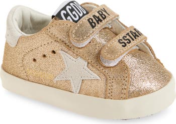 Easy adjustable straps lend quick convenience to this kid-sized, glittery sneaker outfitted with the signature-star appliqué and pre-scuffed details the Italian brand is so known for.
