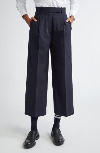 A tricolor grosgrain loop at the back waist puts the label's signature stamp on these pleated pants tailored in cropped length from wool-blend suiting fabric.