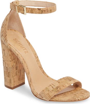 A chunky covered heel defines a sky-high sandal crafted from earthy cork.