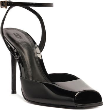 An angular square toe and lofty stiletto heel bring distinct angles to a glossy leather sandal secured with a slim, adjustable strap at the ankle.