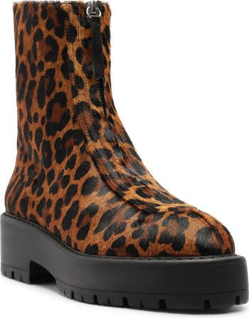 An exposed zipper gleams at the front of a utilitarian-chic moto boot grounded by a chunky lugged platform.