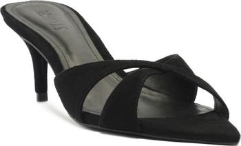 Crisscrossing vamp straps and a sharp pointy toe create a fierce aesthetic on a supple suede sandal lifted by a tapered heel for modest height.