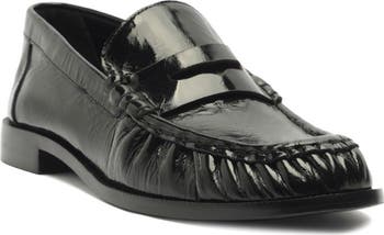 A gathered moc toe and bold profile define a rugged penny loafer designed with a crinkled texture and glossy patent leather upper.
