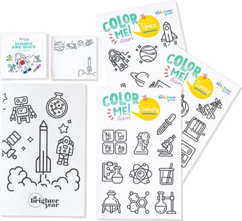 - Includes: 1 Post-it note packet, 1 flip book journal, 1 space & science mini adult coloring book, and 3 color-your-own sticker sheets