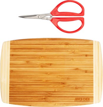 - Includes red handled Joyce Chen Original Unlimited Scissors and an 8x12" Burnished Cutting Board