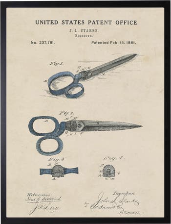 This vintage-inspired print, framed in a black wooden frame, features a scissors patent. Sized at 16 inches by 20 inches, this made in the USA frame makes for a beautiful addition to any wall.