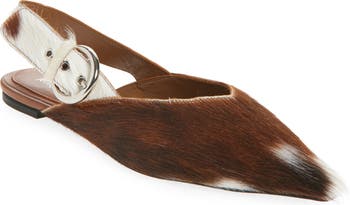 Shaggy-textured genuine calf hair brings bold Western flair to this pointy-toe flat fitted with a retro slingback gleaming with a circular buckle.