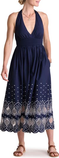 The summery party circuit will adore this eyelet-trimmed dress made from breathable cotton and topped with a shoulder-baring halter neckline.