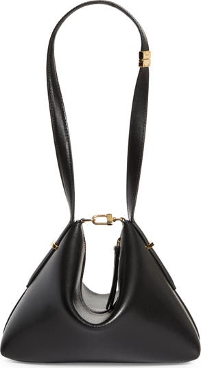 First seen on the runway, this calfskin-leather clutch is designed in a scooped silhouette with a slender strap that can be clasped into a sculptural hourglass shape.