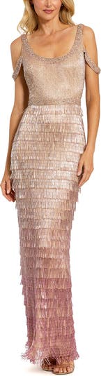 Turn heads in this embellished mesh gown featuring a scoop neckline, drop shoulder straps, and a fringe skirt for a playful, elegant look.