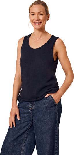 This knitted tank top offers a clean, boxy silhouette with a round neckline and sleeveless design. Finished with subtle roll hems, it serves as a versatile wardrobe staple, combining simplicity with an elevated touch for effortless layering and everyday wear.