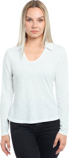 Scoop Neck Long Sleeve Polo Tee with Round Hem A polished take on a casual classic. Crafted in our signature slub fabrication, this tee features a scoop neckline and polo-inspired design, finished with a flattering round hem. Scoop neckline with long sleeves Polo-inspired detailing for a modern twist Rounded hem for a feminine finish Soft, breathable slub fabrication 100% Cotton Imported Machine washable The model is wearing a size Small
