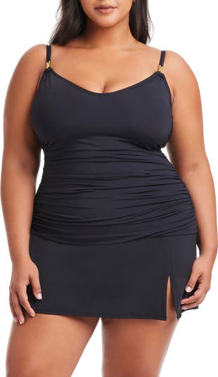 Gleaming hardware brings a hint of sophistication to this shirred tankini top that's perfect for lounging poolside.