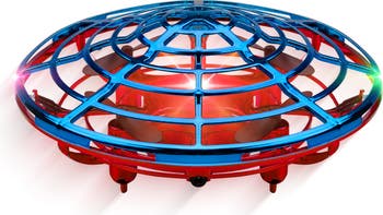 Two-Color Scoot Drone for Kids: This UFO toy version of the original Scoot drone features a blue top shell and a red bottom shell; toss to launch this hand drone into the air and enjoy vibrant LEDs light up this UFO flying toy with every flight 360° Rotating Flight Design: Indoor hover drone for beginners is equipped with powerful motors to fly in all directions; flying with smart, obstacle avoidance motion sensors, simply use your hand to guide its flight and catch this hand drone “hamburger-style” once you’re done Durable and Kid-Safe Webbed Shell Design: This flying toy drone is designed with nontoxic, high quality webbed shell that protects hands, walls, and furniture from the propellers; this webbed shell also keeps the drone safe from damages as it fly around any indoor space US-Certified STEM Toy for Boys and Girls: This UFO drone toy is super easy to fly, making it a great beginner drone for kids and kids at heart ages 8 and up; drone measures 4.7” D, runs on built-in rechargeable drone battery, and includes a USB recharging cable Quality Assured: Fly this cool self flying sensor drone with family and friends for 8 minutes with every 50 minutes charge
