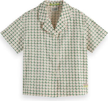A colorful geometric print brightens a kid-size camp shirt that's made of a lightweight cotton blend and perfect for playing on relaxing on sunny days.