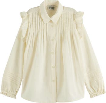 Clip dots texture an all-cotton button-up shirt that's accented with pretty pintucks and shoulder frills to polish your child's look.