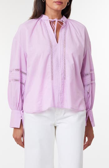 Lilts of lace sweeten a poetically pretty top cut from crips cotton and set with ties at the neck that look lovely open or closed.