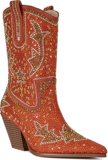Live your rock-star fantasy in this bedazzled cowboy bootie that fuses classic Western edge with sparkling statement style.