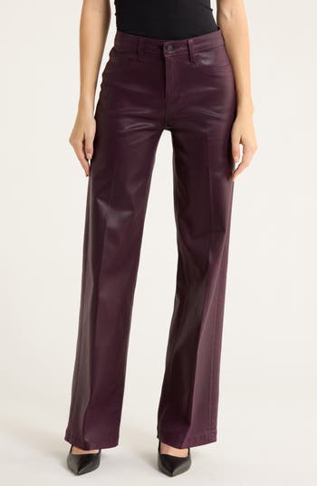A leather-like coating brings a dramatic, weekend-ready edge to high-rise jeans featuring a wide-leg profile and made from stretch-enriched denim.