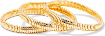 Stack on the shine with this set of textural ribbed bangle bracelets plated in warm 14-karat gold.