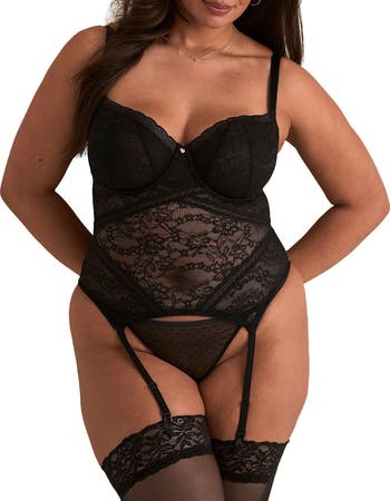 This patchwork lace and mesh balconette bustier features underwire, fully adjustable straps, hook and eye back closure, and fully adjustable garters. It also comes with a matching g-string, perfect for adding a touch of elegance to your lingerie collection.