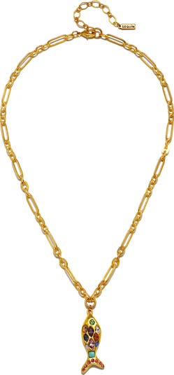 A collection of crystals make colorful scales for the fish pendant at the center of this golden necklace.