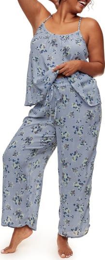 Snuggle up in this cute and comfy cami and pants set! This PJ set is made of woven crepe and features shirring at the neckline, adjustable lace-up back straps, and a cropped-leg pant with an elastic waistband and drawstring. So soft, you'll never want to take it off! (Available in plus-sizes XL-4X.)