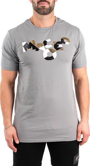 A logo of mixed metallic hues is scattered across the chest of a trim, stretch-added cotton T-shirt finished with side vents for a sporty untucked look.