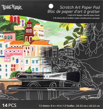 SCRATCH ART PAPER PAD: JOYFUL LANDSCAPES - Unleash your creativity and bring stunning landscapes to life with the Brea Reese Scratch Art Paper Pad – Joyful Landscapes. This kit is designed to make the process of creating vibrant artwork both enjoyable and rewarding. It includes 2 each of 6 pre-designed illustrations, each intricately crafted with bursts of metallic and colorful accents that are waiting to be revealed with every scratch. Perfect for artists of all skill levels, this engaging activity is a great way to relax, unwind, and craft beautiful pieces of art that are ready to be framed and proudly displayed. Whether you’re a beginner discovering the fun of scratch art or an experienced artist looking for a new way to express your creativity, this pad offers endless possibilities to explore. The included tools help you create the perfect finished piece, allowing for fine details and smooth, vibrant effects on each landscape. Whether you're looking for a way to unwind after a long day or a fun new project to tackle, this kit offers everything you need to create art that will bring joy to any space. INCLUDES: 12 Sheets, 1 Dual Tip Stylus, and 1 Brush.