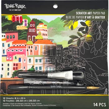 SCRATCH ART: PAPER PAD - JOYFUL LANDSCAPES - Escape into a world of color, travel, and creativity with the Brea Reese Scratch Art Paper Pad 8x8 – Joyful Landscapes. This destination-inspired scratch art collection lets you reveal six stunning scenic designs from around the globe, all brought to life with vibrant rainbow hues and shimmering metallic effects hidden beneath the surface. Journey to a sun-drenched Italian coastline with cliffside homes and turquoise waters. Relax at a charming European café terrace as hot air balloons drift across the sky. Discover a breathtaking alpine mountain lake surrounded by dramatic peaks. Unwind on a tropical island beach lined with palm trees and sailboats. Explore a desert canyon filled with towering cacti and warm sunset tones. Stroll through romantic Paris with the Eiffel Tower framed by blooming florals and golden skies. This complete kit includes 12 quality 8" x 8" scratch art sheets (2 sheets each of the 6 unique designs), along with a wooden stylus for precise scratching and a brush to easily sweep away debris—everything you need to create vibrant, detailed masterpieces. Each sheet features guided outlines, making it easy for artists of all skill levels to create intricate, professional-looking artwork — no drawing experience required. Simply scratch along the design to reveal brilliant color, striking contrast, and eye-catching metallic shimmer. Perfect for teens and adults, this scratch art pad offers a calming, screen-free creative escape that encourages focus, relaxation, and mindfulness. Whether you're crafting solo, enjoying a cozy night in, or giving it as a thoughtful gift, Joyful Landscapes provides hours of satisfying artistic expression. Once complete, your finished pieces are frame-ready and perfect for displaying as vibrant, travel-inspired décor in your home, office, or creative space. Turn every scratch into a scenic adventure and transform simple black sheets into dazzling works of art.