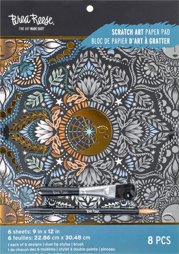 SCRATCH ART: PAPER PAD - MOON & SUN - Embrace the celestial beauty of the sun and moon with the Brea Reese Scratch Art Paper Pad - Moon & Sun. Scratch and Display! Follow the outlines to reveal the art beneath. Scratch as much or as little as you like! This scratch art kit features six intricate designs inspired by cosmic and botanical motifs, blending the mysticism of the cosmos with vibrant, gilded patterns. The contrast of black backgrounds and shimmering metallic elements creates a striking visual effect as you reveal each hidden design. Perfect for both beginners and seasoned artists, the kit includes a dual-tip stylus and brush, allowing you to scratch with precision and ease. Once complete, your ethereal designs are ready to be framed, adding an enchanting touch to any room. Craft kit INCLUDES 6 Design Sheets (9" x 12"), 1 Brush, and 1 Dual-Tip Stylus.