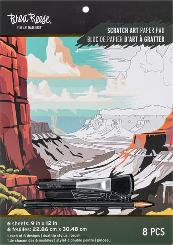 SCRATCH ART: PAPER PAD - DESTINATIONS - Explore some of the world's most iconic landscapes with the Brea Reese Scratch Art Paper Pad - Destinations. Scratch and Display! Follow the outlines to reveal the art beneath. Scratch as much or as little as you like! This travel-inspired kit features six mesmerizing designs that capture the beauty of famous landmarks and vibrant cityscapes. From the majestic cliffs of the Grand Canyon to the palm-lined beaches of tropical coasts, and the bustling skyline of city centers, each scratch reveals intricate details with pops of metallic color. The set includes a dual-tip stylus and brush for precise crafting, ensuring your artwork stands out beautifully. Whether you're a seasoned artist or new to scratch art, this kit provides a fun, meditative way to celebrate global destinations from the comfort of home. Craft kit INCLUDES 6 Design Sheets (9" x 12"), 1 Brush, and 1 Dual-Tip Stylus.