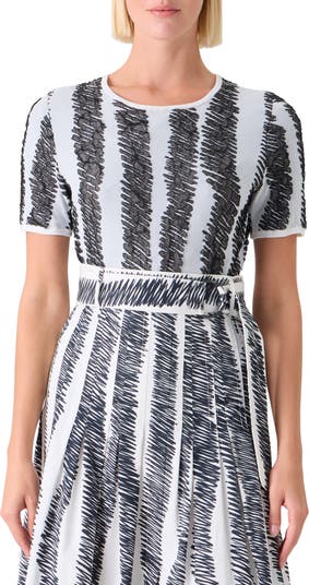 Inky scribbles rendered in jacquard designs brings a sense of joie-de-vivre to this short-sleeve sweater knit with shape-retaining stretch fibers.