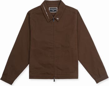 A brand signature and a nifty pin authenticate a casual jacket made from sturdy cotton canvas.
