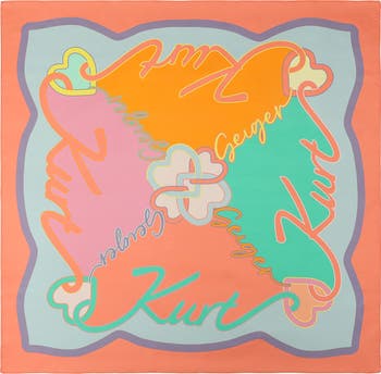 Vibrant script lettering enliven this silk square scarf designed in a bold, modern palette.