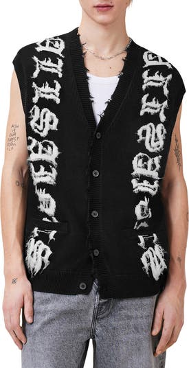 Ornate intarsia logo letters center a cotton-rich sweater-vest fashioned with grungy touches of fraying at the edges.