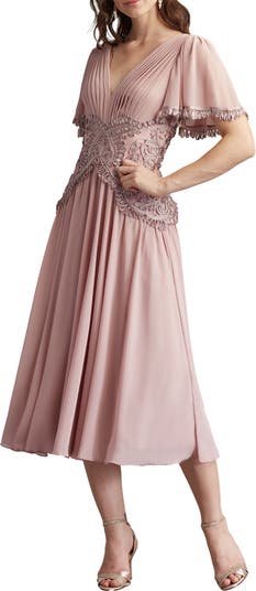 Scrolled details add refined charm to a flutter-sleeve dress cut to a beloved midi length and painted in a dreamy hue.