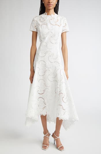 Openwork detailing offers an air of lightness to this dress made from guipure lace in an intricate scroll design and finished with a modern asymmetric hem.
