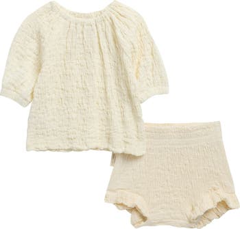 This softly puckered set is made of a comfortable cotton blend that keeps baby feeling their best as they giggle the day away in this dress paired with matching bloomers.