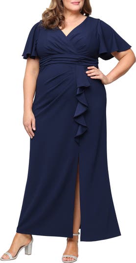 Stretchy scuba fabric creates the sleek silhouette of an occasion-ready dress accented with ruffles and a subtle side slit.