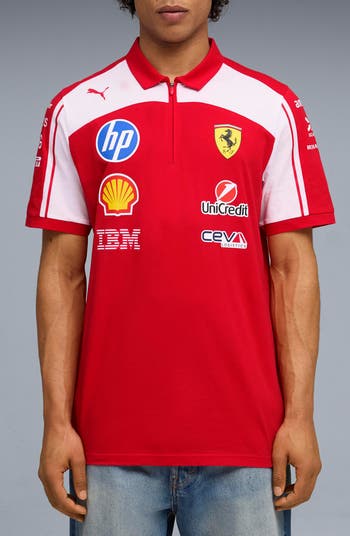 You'll look like you just walked out of the team paddock every time you build your race-weekend look around this authentic polo complete sponsor patches and Ferrari's performance styling.