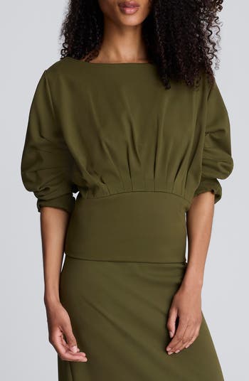 An elegant boat neck and puffy, darted sleeves frame this sculptural crop top textured by a gently gathered bodice with a wide waistband.