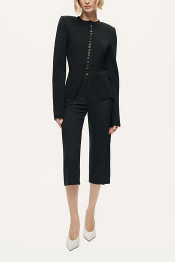 Elegantly contoured for a flattering silhouette, this sculpted knit top is designed in a slim fit with a classic crew neckline and tonal button-front detailing. The shaped waist enhances definition, flowing into a subtle front-split peplum hem that adds movement and a feminine finish. Crafted from a soft stretch knit with long sleeves and an unlined construction, it offers comfort while maintaining a polished look. Perfect for pairing with tailored trousers, skirts, or denim for elevated everyday style.