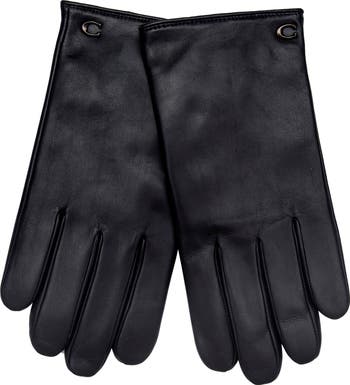Cozy merino wool warms these luxurious leather gloves enhanced with signature logo accents and touchscreen-compatible fingers.