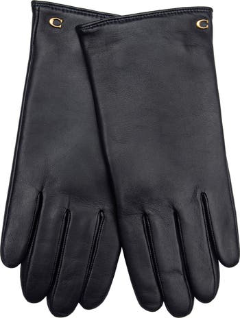 Cozy merino wool warms these luxurious leather gloves enhanced with signature logo accents and touchscreen-compatible fingers.