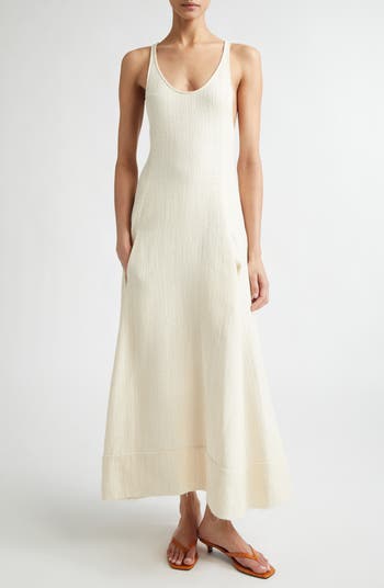 Sculpted from midweight cotton sablé with a rustic texture and fluid drape, this shoulder-baring racerback dress is completed with a wide band at the hem left with an unfinished raw edge.